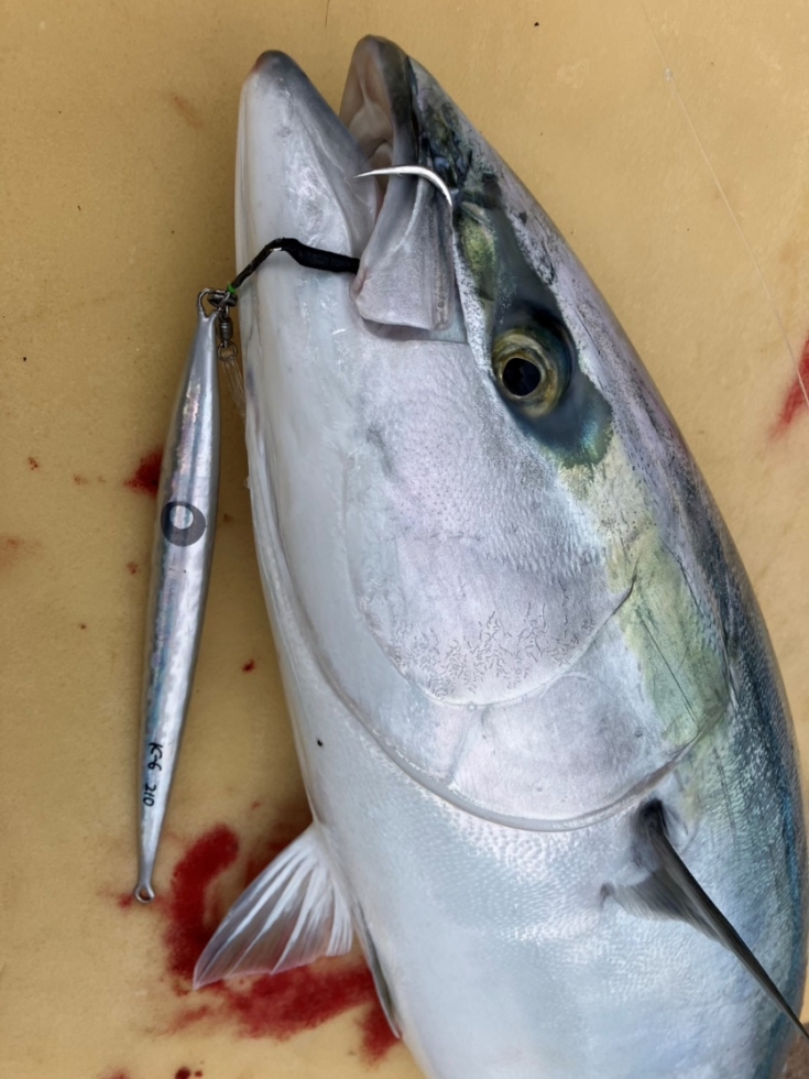 そして私も痺れをきかせジギングにかえます。ガタージグスリム210gにブルーチェイサー9/0です。するとすぐに小マサが釣れてくれました。これで坊主逃れと・・しかし船酔いはいっこうに治りません。