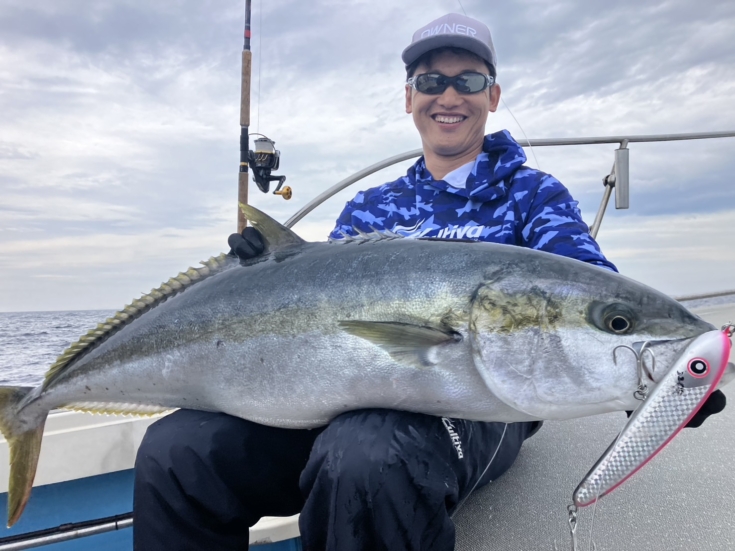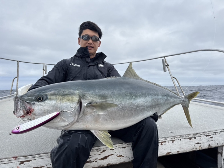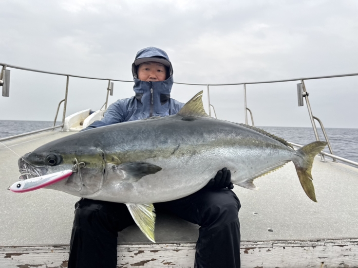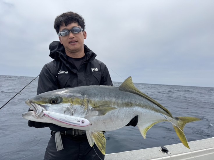 同行の尾上さんにモンスターヒラマサ24キロ。
