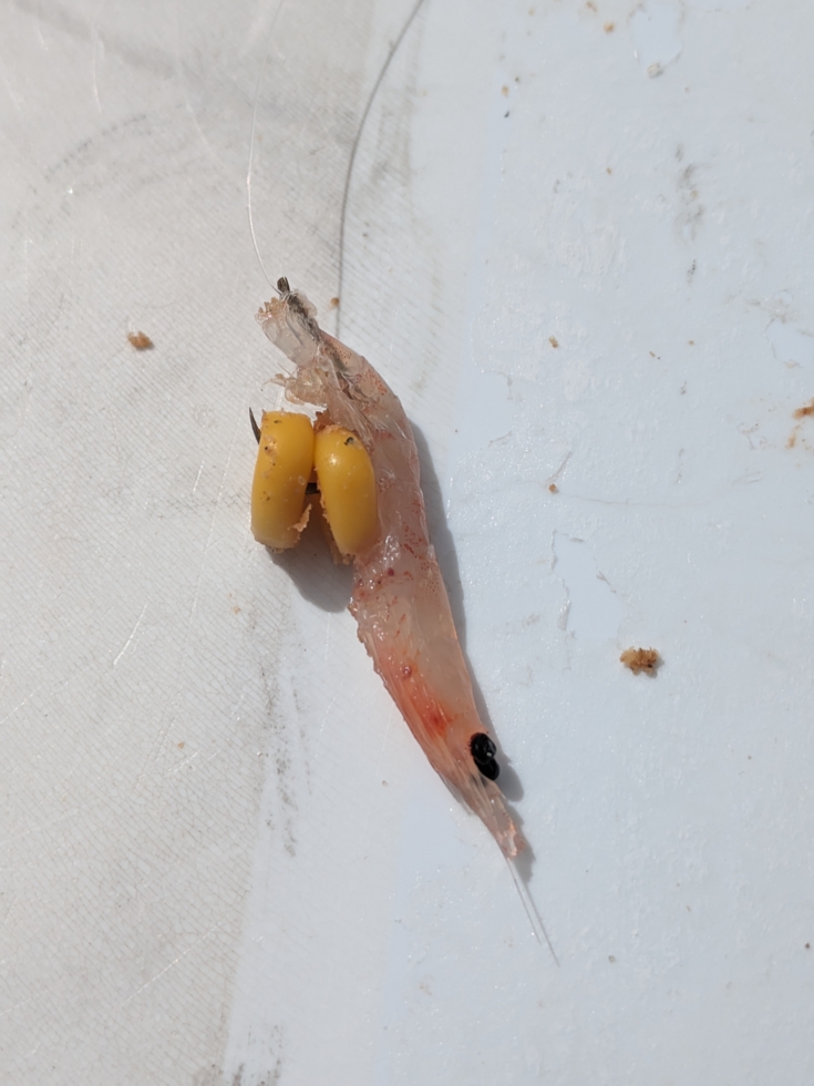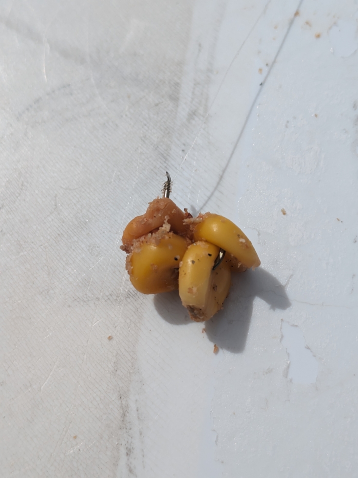 使った理由として、LLサイズのオキアミとコーン抱き合わせる、4ヶ以上のコーンを数珠掛けするなど、複数のサシエをたくさんつけたいゆえ大型号数が必要で、その結果、サシエのホールド力を高め、アピール力へと結び付くと実感しています。