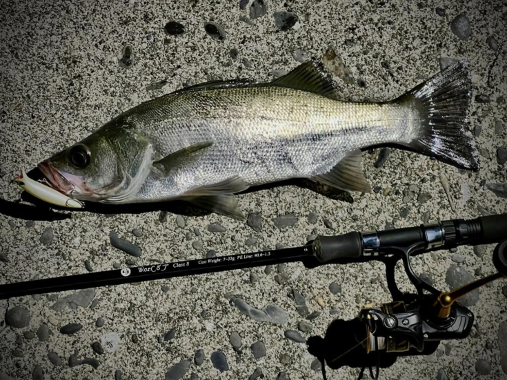 初日にキャッチした2尾を皮切りに、2日目は30cm前後が連発した後、後半になって念願の40cmクラス。3日目に50cmクラスとサイズアップに成功。おまけに足元でボイルするヒラスズキをミノーで2尾キャッチして、遠征釣行をとても満足いく結果で終えることができた。