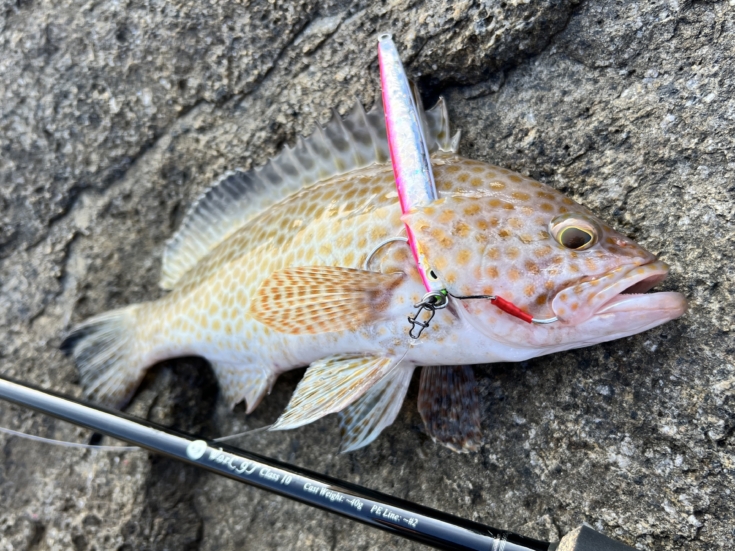 中でもハタ類の魚影はすさまじいもので、最終日の日中には、湾岸PROヘッド+ソフトルアーのジグヘッドリグに、アカハタがヤミハタ交じりで怒涛の30以上連続ヒットを記録。素鉤を引くことがありません。