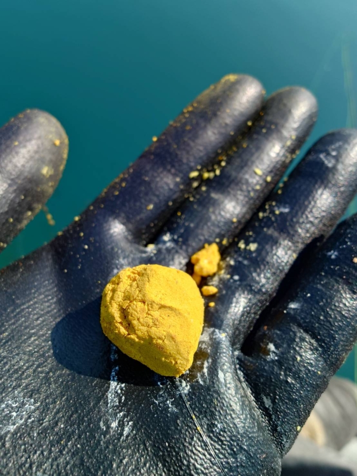 開始早々から強烈なモーニングは無いようなので、さぐり釣りの竿に『海上つり堀カラーシンカー』0.5号と閂マダイX10号をセット。餌は黄色の団子で置き竿に。