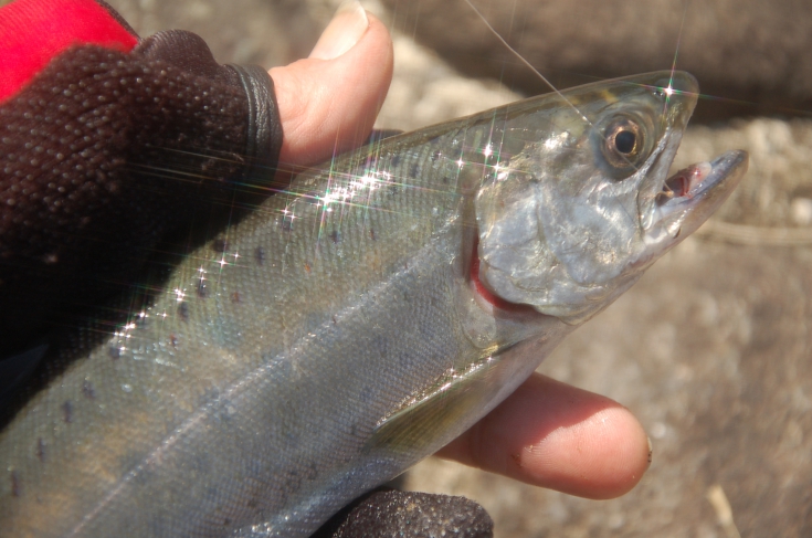 手前筋から生イクラを本流クイン8.0号に4粒刺しして、流しますが水温5度のフィールドはなかなか大アマゴとのコンタクトはできません。