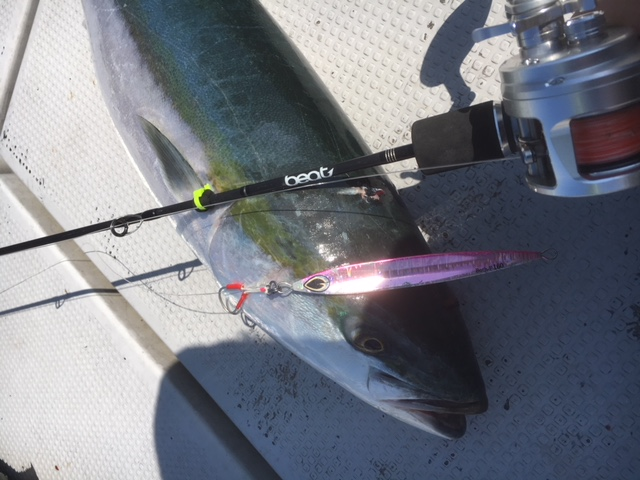 私にはなかなかHITまで持ち込めず流すたびにジグを交換しますが、全然だめで船長のアナウンスと同時に回収したら、ドン!!と反射喰いしました。