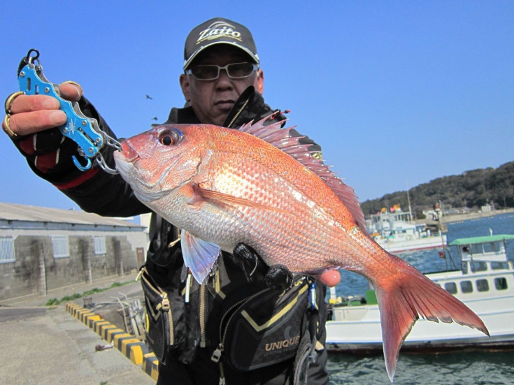 すると数投目、ラインを弾き出すアタリを捕えることが出来た。慎重に釣り上げたのは、ピンクが鮮やかな良型マダイ!