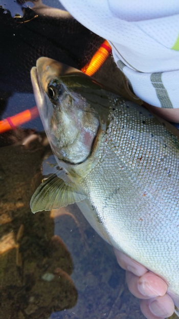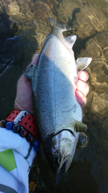 あわせと共に上流へ疾走する魚を丁寧に往なして玉網に入ったのは、白銀の体躯にオリーブがかった太い防弾型の脂鰭!