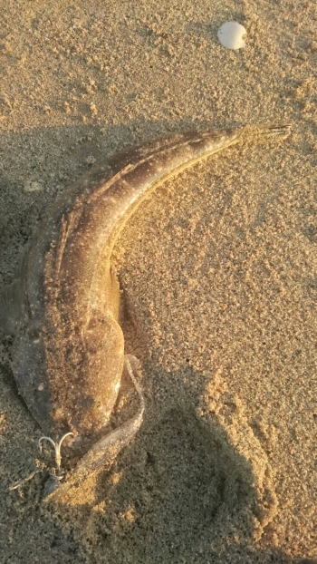10分ほど歩いて、足下から深そうな波の弱いポイントを見つけてソフトルアーで探る。