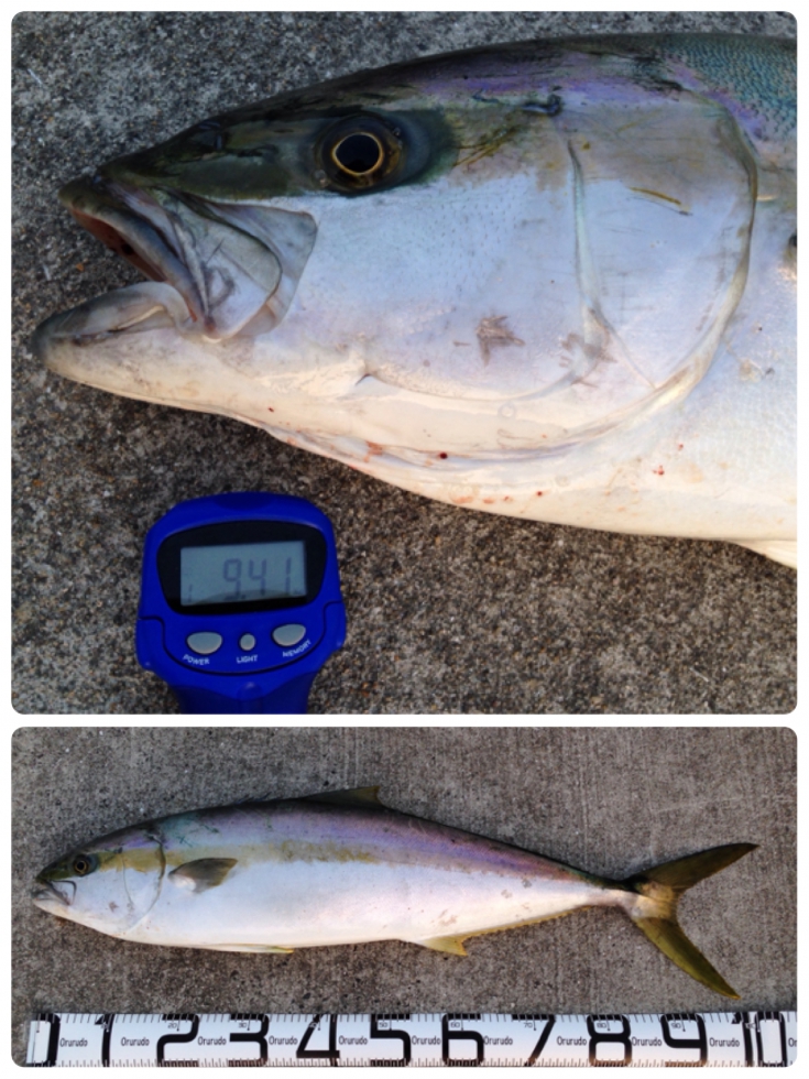 ●釣行日:2018年7月15日 ●お名前:ひこいち ●ポイント(場所):九州北部 ●使用商品名・号数:SJ-38 2/0 ●魚名:ヒラマサ、ブリ ●全長: cm ●重量:9.4kg 6kg