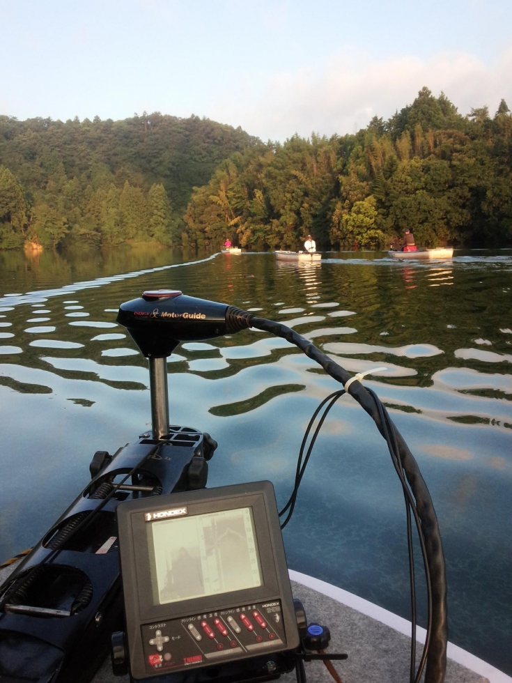 スタートの掛声の後に3人の釣り名人の背中と魚探!?を見ながらゆっくり追いかけました。