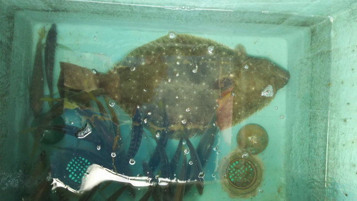 サビキを手づくりしてアジゴを釣り、そのままヒラメ狙いですが、アジが大き過ぎてやっと釣れた一枚です。