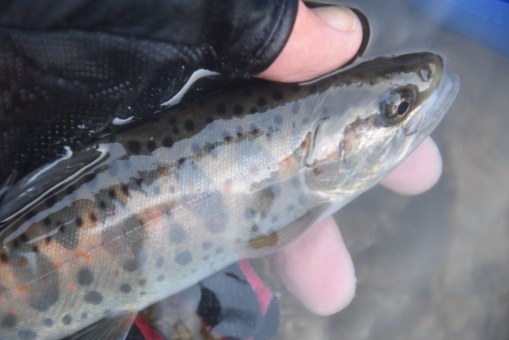 当日のターゲットは、綺麗な幅広アマゴ。期待に応えてくれるように手前筋からいきなりヒットしたのは、18cmサイズのアマゴ。