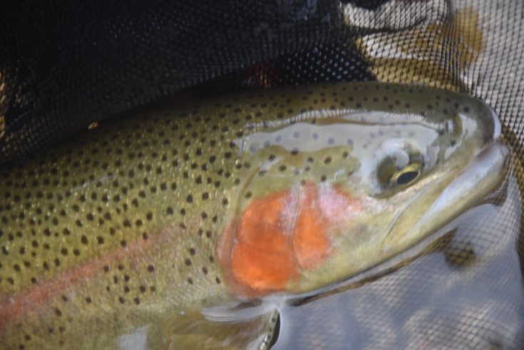 目印が「ピタリ!」と止まり、大物のトルクフルなパワーがサオ先を「グイ・グイ!」と、引き上げます。しっかりブロックを固めて、下手に身構え臨戦態勢での流れに乗せてタモに取り込んだのは、40cmアップの頬に婚姻色を付けたレインボー。