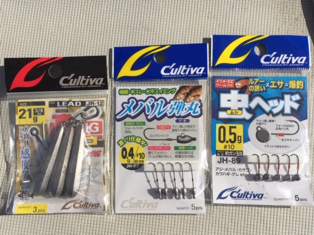 針(ジグヘッド):カルティバ 虫ヘッド 0.5g/#10 メバル弾丸 0.4g/#10