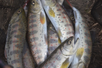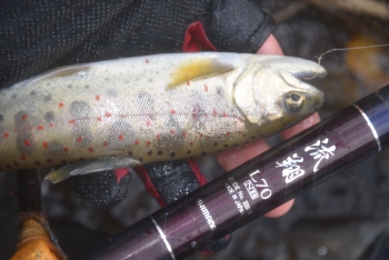 連発するアタリに気を良くして、エサテンカラ釣法でチャレンジすると、無理なくスレアマゴがヒット!ここでも大満足の至福1匹をキープすることが出来ました。