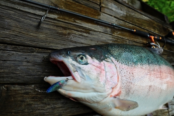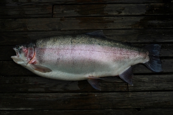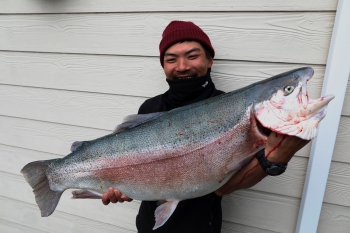 ●釣行日:2019年4月11日 ●お名前:苔塚吃々 ●ポイント(場所):Lake Tekapo ●使用商品名・号数:S-61 #1/0 ●魚名:虹鱒 ●全長:91 cm ●重量:13.6 kg