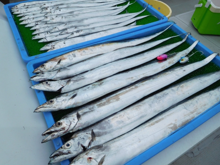 小型の群れなのか、中々掛けれない状況ながら『掛獲船太刀魚テンヤ』が小型もしっかり掛けて釣果を伸ばす。
