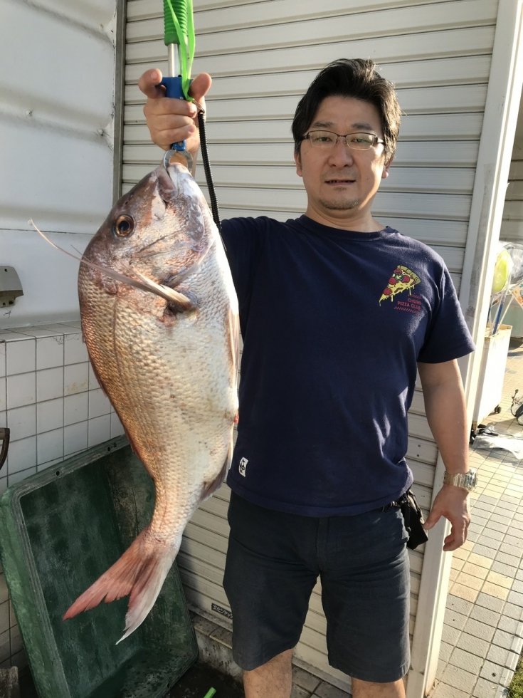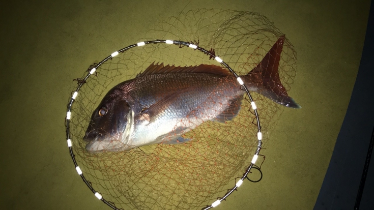 いつもジョインアックス交換フック5/0とST46#8でバス用ワームの自作リグでナイトシーバスを釣っているのですが、今回は釣り場に着いて2投目でワームの後ろをチェイスしてくる魚影が見えて、リトリーブ代が無くなってきたのでロッドワークでワームの軌道を変えた途端、チェイスしていた魚影がワームを咥えて持って行ったので合わせると、ドラグを鳴らしながらラインが出て行き、これはモンスター級のシーバスと思いやり取りすること約15分、上がって来たのはシーバスではなく、モンスター級のマダイでした!