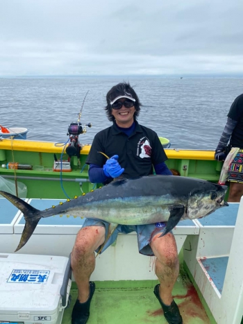 ●釣行日:2020年9月13日 ●お名前:クスノキ ●ポイント(場所):相模湾 瀬の海 ●使用商品名・号数(使用鈎・仕掛・ルアーなど):カットヒラマサ16号 ●魚名:キハダマグロ ●全長:120 cm ●重量:29.8 kg