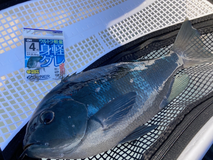 ●釣行日:2020年11月4日 ●お名前:セイチ ●ポイント(場所):和歌山県串本町安指 沖磯 ●使用商品名・号数(使用鈎・仕掛・ルアーなど):身軽グレ 4~5号 ●魚名:口太グレ ●全長:30~35 cm ●重量:未検量 kg