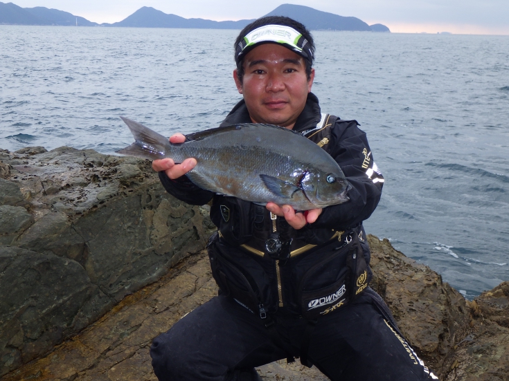下げ潮が緩く流れ出すと、先ほどまでの低活性が嘘のように急激にグレの活性が高くなり、30~35cmの尾長グレが1~2投毎にヒットします。