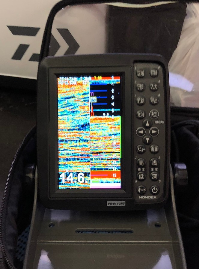 小屋について魚探をいれると、まるで五線譜のように細い線が6mから15mの底まで何本も。
