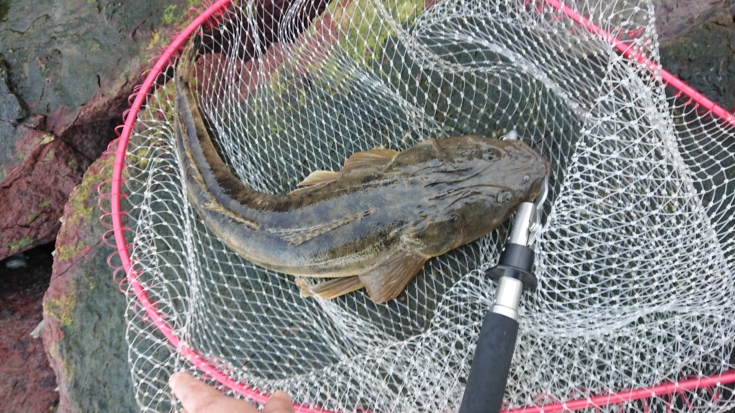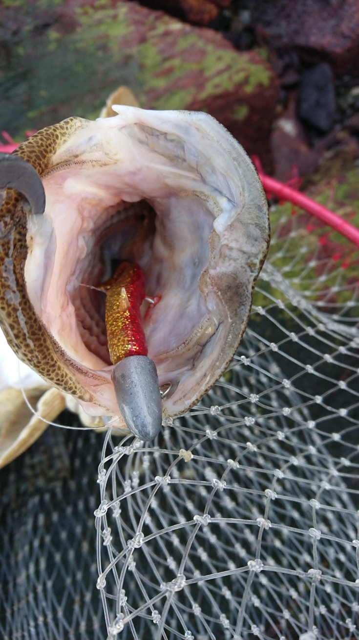 ワームをお気に入りのパワーシャッドに変更してキャスト。ボトムから優しくダートさせてフォールを繰り返します。すると、小さくコンッ!というバイト。食いきらないので激しく誘いのダートをいれるとガゴッ!ヒットしました。よお引いて良型確信。いなしながらネッティングして無事捕獲できました。横幅、厚みたっぷりのマゴチ!