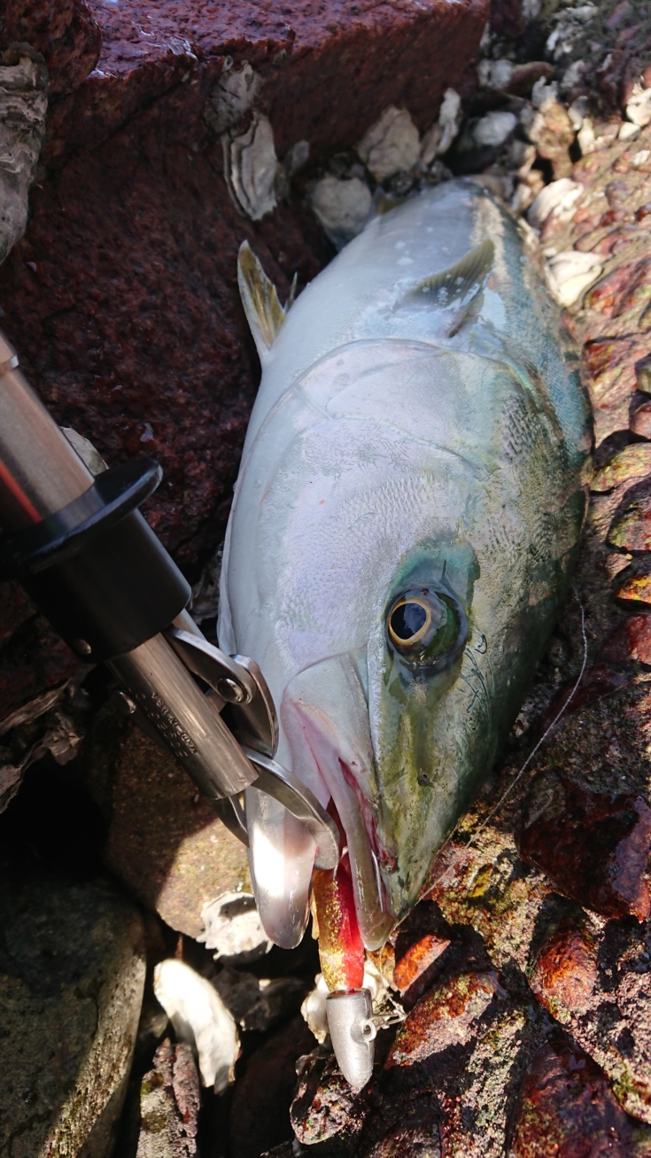 足元は牡蠣ガラで危険なんでドラグを緩めて走らせます。弱ったタイミングで何とかネッティングできました。