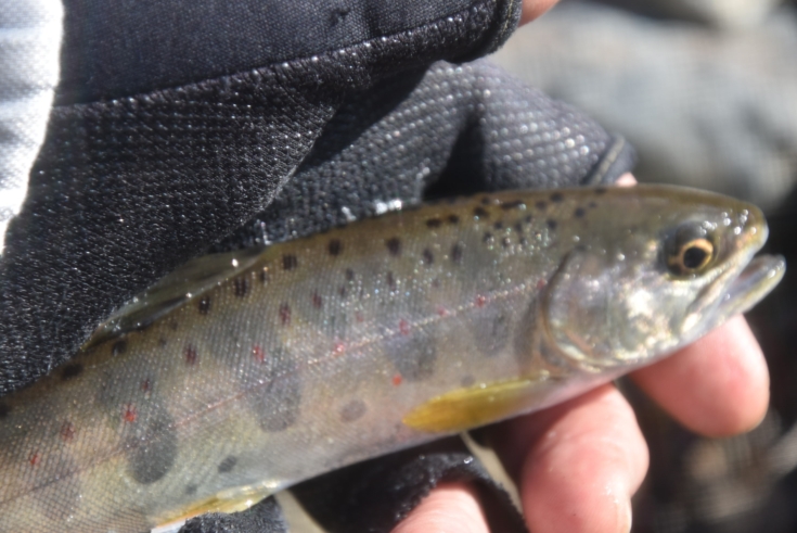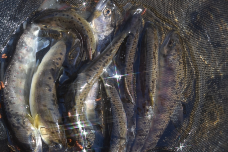 幸先よくヒットした1匹目の新子アマゴは、綺麗なメスアマゴ。その後も同ポイントで連発ヒットとなります。手返し良く釣りリズムに乗ることができ、手元カウンターは12匹。