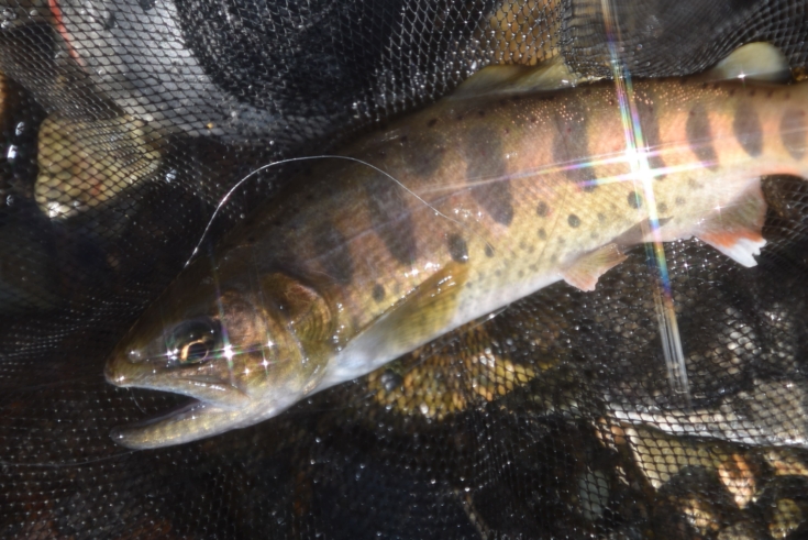 その後、やや流れのある2本目の流れ筋を流すと、「ピタリ!」と目印が止まり、パワーある引きと共に宙を舞って手元のタモに飛び込んできたのは、ナイスサイズのオスアマゴ。やや婚姻色を纏い精悍な顔つきはとてもイケメンです。