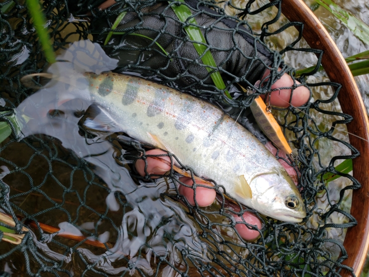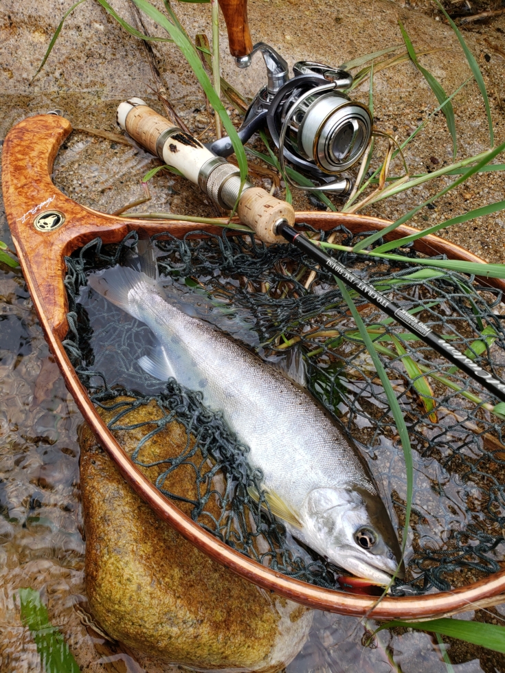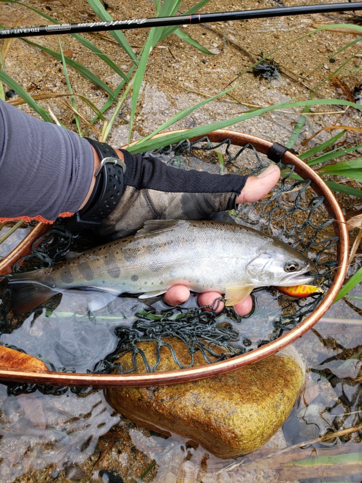 そのあとガンガン瀬で掛けるもバラシ、そうだst-11に替えようとメテオーラにセット。すぐに答えは出ましたスレ掛かりでまずまずのアマゴ。そのあとも釣れて満足の納竿。