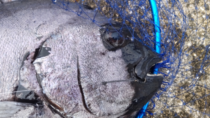 例え貫通はしていなくともザ・ROCKの鋭い鈎先は深く刺さり込み、その懐で石鯛のパワーを受け止めるので60overの強烈な走りにも堪えてくれます。