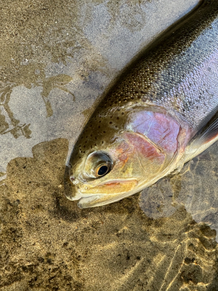 綺麗な虹鱒が見え、そのまま気を抜くことなくタモに収め、サイズを計ると、なんと54センチ。