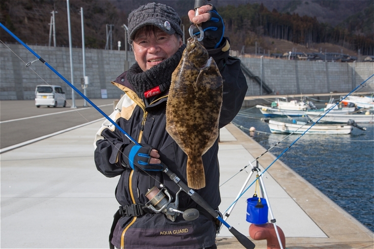 まずはカレイのポイントを教えて頂き移動。この日は晴天にもかかわらず小雪が舞う東北らしい天候。ただ北西の風が強く釣り辛い状況でした。