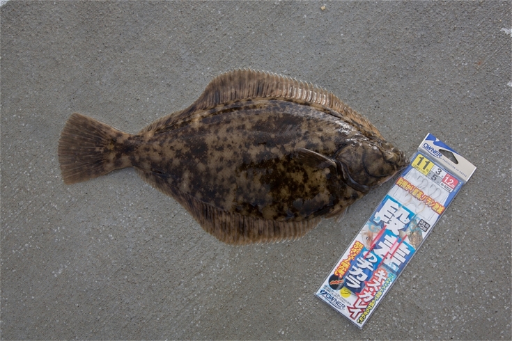 少し仕掛けを動かしてみると「ヒット」。引きは強く、手前に有る根に入ってしまいましたが上手く出す事が出来て無事ネットイン。41cmのマコガレイ。嬉しい。ここで釣行終了。風が強い1日でしたがアタリも多く楽しめました。