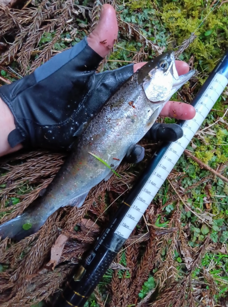 魚にイクラ餌を見切られたら、ブドウ虫、ミミズと餌を変え、ラインとハリをサイズダウンしながら、ポイント移動し釣り歩く。