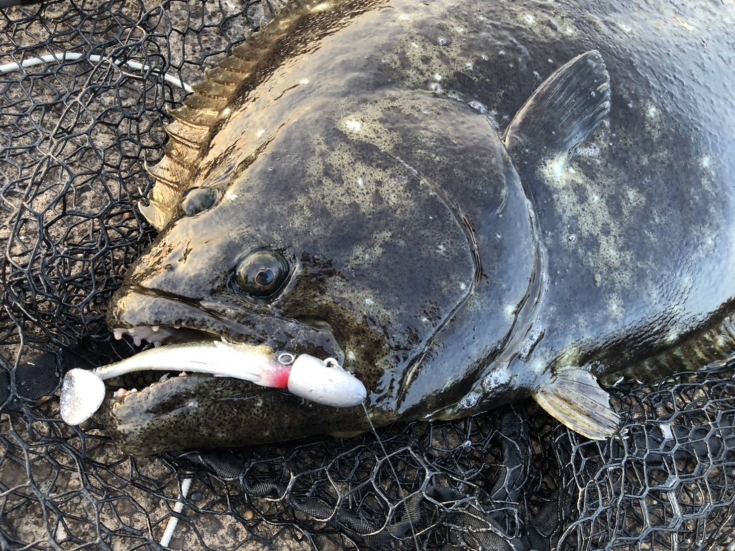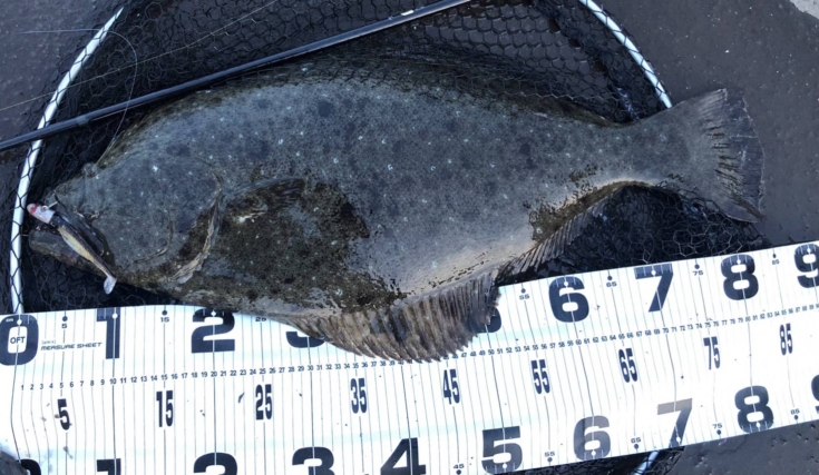 開始時刻は18時で、17時半の満潮から下げ始めたタイミングでした。70~80m程正面にキャストし、ボトムから50cm前後のレンジキープをしながら手前までリトリーブという行程を何度も繰り返すこと40分程、手前20m程の基礎ブロックと砂地の境目辺りに差し掛かった時に「コツッ」とした小さなアタリ。フッキングしても全く動かず、更に力を掛けるとようやくヌルっと動き出し大物であると確信。一旦様子をみるためドラグを緩め魚の凄まじい突っ込みをやり過ごしつつ、おおよその力の強さを確認したところで慎重にドラグを締めていき、時間を掛けながら魚を寄せ無事にネットイン!