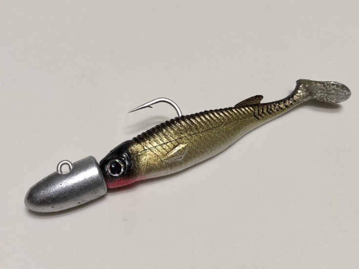 ここ数年、この釣り方をするうえで私が気に入っているのが静ヘッドです。安定した水平姿勢をキープし、しっかりと足元までアプローチできる点、ヘッドが均等に水を受け流すためワームの引き抵抗を感じやすくレンジキープが容易な点、ワームのアクションを邪魔せず本来の性能を引き出せる点(特に今回はフラットサイド形状のワームのローリングアクションを引き出し、強い明滅を演出できたのではないかと考えています)が気に入っています。私の今までの経験上、漁港、港湾部のヒラメは意外と手前の基礎ブロックに着くことが多く、特に大型はあまり動き回らず一等地で餌を居食いする傾向にあると思っており、実際に釣り上げた座布団クラスの殆どがそのような場所で釣れています。そのため大型狙いとしても上記のような静ヘッドの特性は大型狙いにマッチしているものと思っています。また、今回のような特大サイズのヒラメに対しても全く曲がることのない強靭なフックも、いざという時の強気なやり取りを安心して行う事が出来る強みであると思っています。