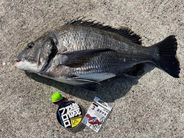 チモト(針上30cm)にガン玉G5をセット、鈎には先端が鋭い速手チヌ3号を使用、ツケエはエサ取りも無で終日オキアミ生で十分でした。