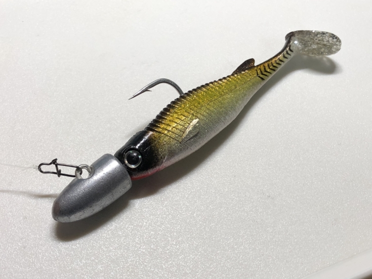 私が漁港、港湾部の大型ヒラメ狙いで常に集中して取り組んでいるのがジグヘッドでのリトリーブの釣りであり、その中でも特に気を付けているのがレンジです。ボトムから50㎝程度を目標に均一なレンジキープを行うにはリグの巻き抵抗を均一に保つことが大事と思っています。潮流の方向やスピードの変化に対応する際に活躍するのが静ヘッドであり、ワームの引き抵抗を邪魔しない形状はシャッドテール系ワームのボディとテールの振動をより感じ取りやすく、引き抵抗の調整がしやすくなるので大変重宝しています。また剛力スナップは、引っ張り強度はもちろんの事、開きにくさにおいても非常に強力なため今回のように大物に対して躊躇いなく強気なドラグ設定で挑む自信に繋がると思っています。