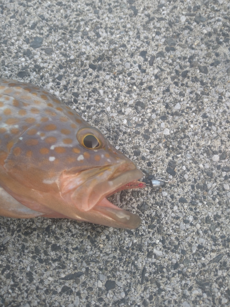 風が強く潮も結構流れてたので、1gではきつかったけどもゆっくりと巻いてるとゴソゴソっとしたアタリが。