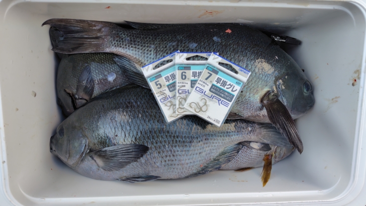 まだ水温が高いのでウキは0シブ、鈎は独特の形状で向こうアワセでも高確率で口元にフックする早掛グレ7号、ハリスは2号とします。