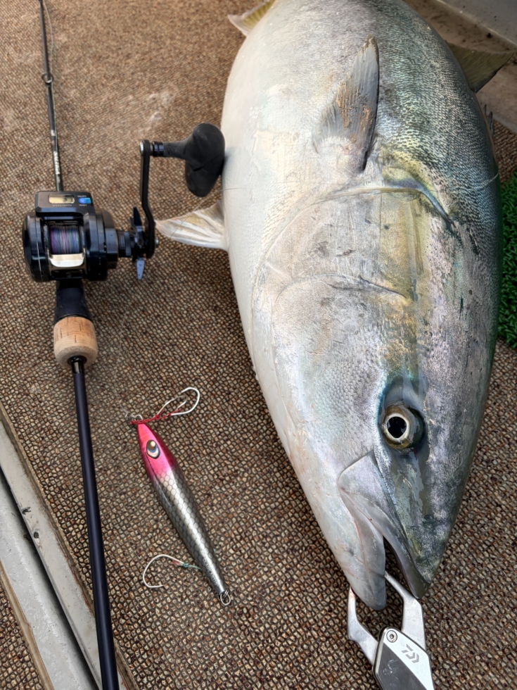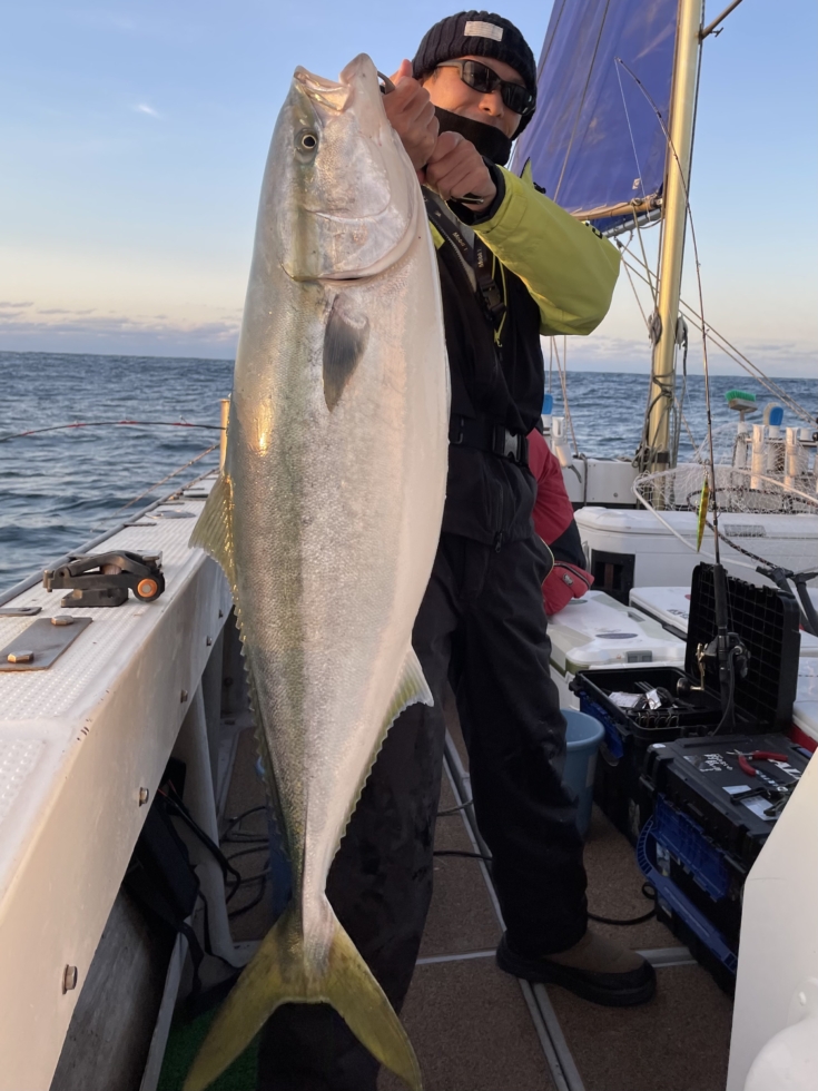 全く釣れない中もうすぐ沈みそうな夕日を眺めながら、最後のパワーを振り絞る形で、底から一気に 30m早まきワンピッチでフッと抜いたら、大きくドーン!