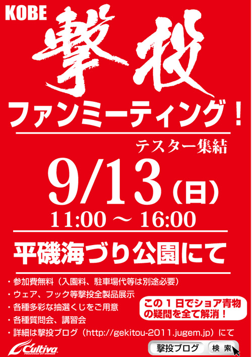 9/13、兵庫県神戸市平磯海づり公園で、撃投ファン交流のイベント「撃投ファンミーティング神戸2015」を開催いたします。