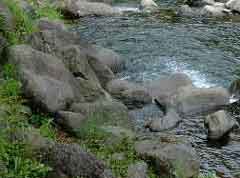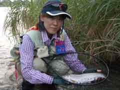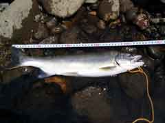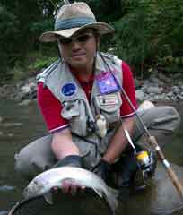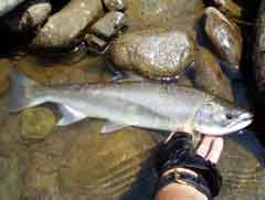 この猛暑の中で、40オーバーが出るとはラッキー。しかも夫婦でダブルゲットでした。昨年から、ルアーのフックは、全てCultiva STINGER TREBLEシリーズに変更。それ以来、魚のバラシがほとんどなくなりました。イワナの他に夫婦でサクラマスも狙っていますが、こちらもフッキングは完璧で、2004年の結果は、私が11本。妻は2本のサクラマスをゲットしています。