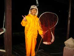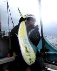 初日ノーヒット(涙)。2日目は前日以上に波が高く、出船も危ぶまれたが、船長と釣人の執念!?で波落ちを昼前まで待って遅めの出船。目標のメーターオーバーがネットに入った瞬間、思わず「ヨッシャー!」。