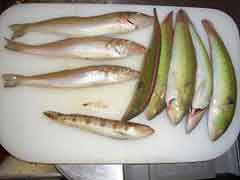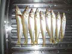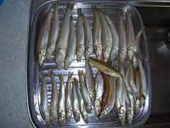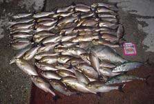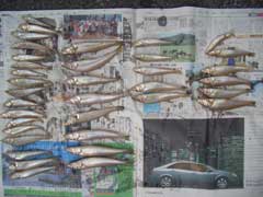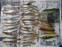 8月6日、広島県宮島での釣果です。キスが36匹です。20pまでです。ハリはジャストキス6号でした。アタリがあると確実にフッキングしました。この針にはいつもお世話になっています。 |