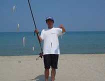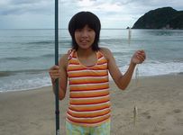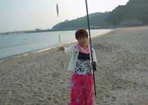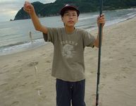 | 9日、先週に引き続いて鳥取へ海水浴を兼ねたキス釣りに家族で出掛けた。「近くにトイレがある所」と言う女性陣の要望で、青谷海水浴場で開始。仕掛けは幹糸が「ザイト.フロロ」の1.5号。ハリスも「ザイト.フロロ」の0.8号。ハリは「赤ジャストキス」6号を使用。 |