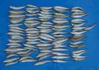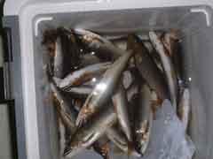 | キスの食いはすこぶる快調で、釣れるサイズも15〜18cm級が主体だから毎回、ブルンブルンと竿先に鮮明なアタリがあった。そんなキスが上げるたびに4〜8連の鈴なり。とうとう午前11時過ぎには餌が底をつた。近年にない程の大爆釣で、クーラーの中には320尾も入っていた。 |