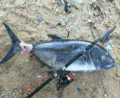 仕掛けは竿:磯竿10号、リール:大型スピニング(9000番)、道糸:PEライン8号(80Lb)、ハリス:ナイロン40号、針:オーナースーパームツ20号です。
