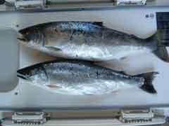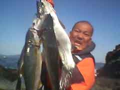 写真は4月29日に仲間の兵エ氏が青海海岸で釣った48cmと私の釣った43cmの写真です。